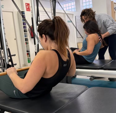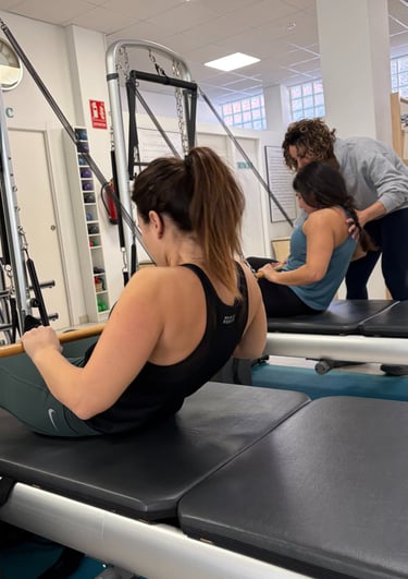 En estas sesiones utilizando diferentes aparatos: Reformer, Torre, Small Barrel y Mat. El trabajo de suelo se complementa con accesorios como el aro mágico y la barra, y en algunas clases incorporamos también la Silla (Wunda Chair), aportando variedad y riqueza al entrenamiento.